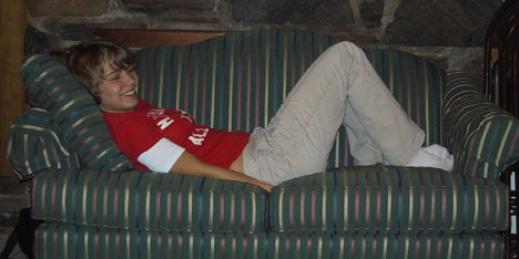 Hayden laughs at Jon Shi's graduation speech.